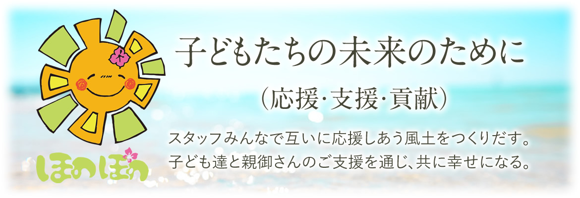 | 「ほのぽの」とは | ハワイ語で「ホノホノ」は散歩という意味があります。 子ども達一人一人歩み方はそれぞれです。 その歩みに大人の都合で早くしたりしまいがちです。 時には「ポ~」と立ち止まることも大切だと思っております。 一人一人の児童に真摯に向き合い、太陽の暖かい日差しの中、ご家族の方々と伴に支え合い歩んで行けたらと「ほのぽの」と名付けました。 |