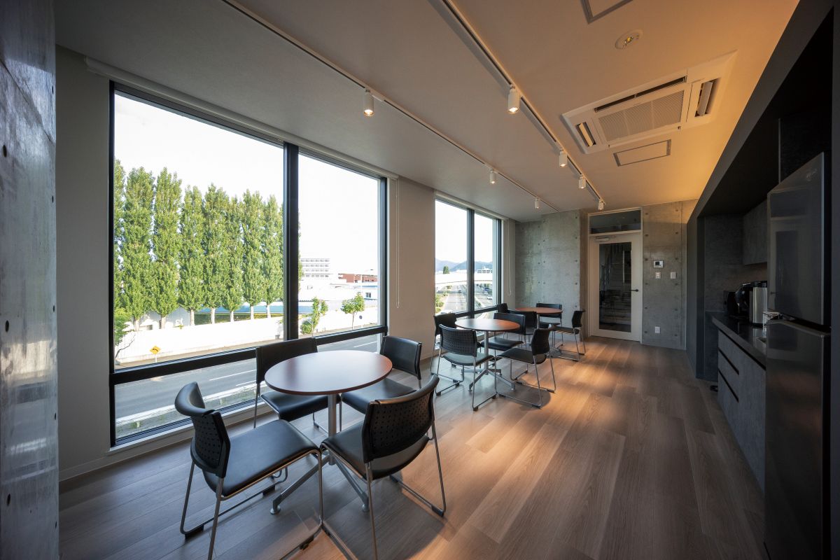 現場から「ただいま」と帰りたくなる、自慢の新社屋 仕事の合間に大きな窓から光が差し込むラウンジで最高の景色とコーヒーを。